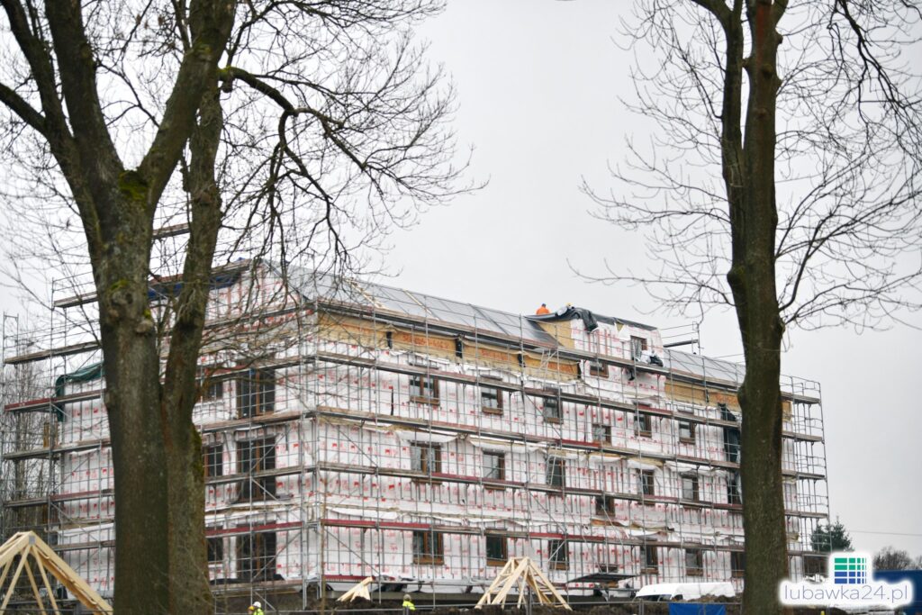W obecnej fazie budowy trwa montaż więźby dachowej.