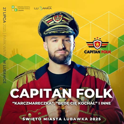 Hity takie jak „Karczmareczka” i „Będę Cię kochał” mają łącznie ponad 20 milionów wyświetleń na YouTube, a jego energetyczne koncerty porywają publiczność w całej Polsce! Stylowy, charyzmatyczny, zawsze w mundurze – Capitan Folk to wulkan scenicznej energii i gwarancja dobrej zabawy!
