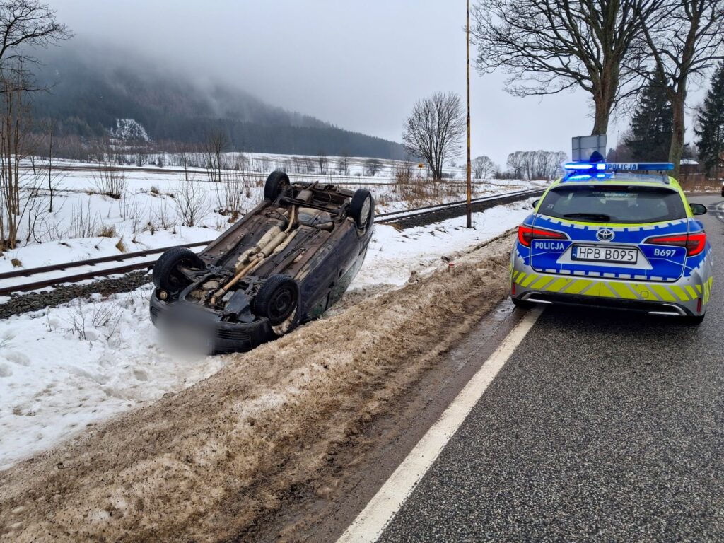 Policjanci Wydziału Ruchu Drogowego Komendy Powiatowej Policji w Kamiennej Górze ustalili, że 71-letni kierujący z powiatu wałbrzyskiego nie dostosował prędkości do warunków panujących na drodze, w wyniku czego na łuku drogi zjechał z jezdni i dachował. Mężczyzna jechał sam, nic poważnego mu się nie stało.