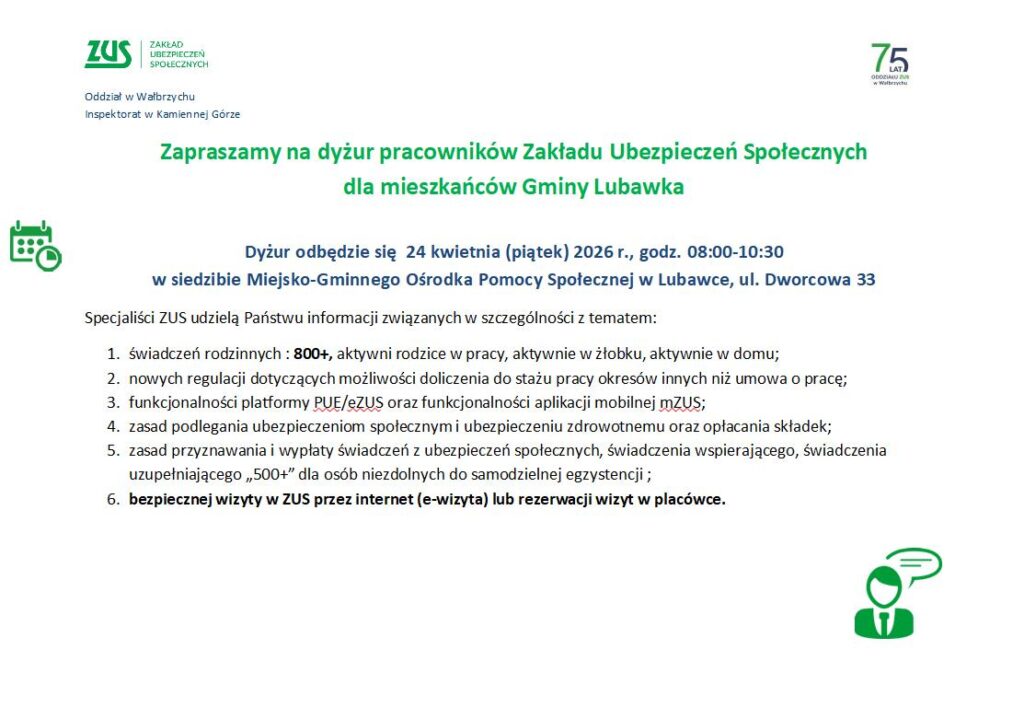 Miejsko-Gminny Ośrodek Pomocy Społecznej w Lubawce zaprasza na dyżur pracowników ZUS, który odbędzie się 24 kwietnia 2026 r. w godzinach 8:00–10:30.