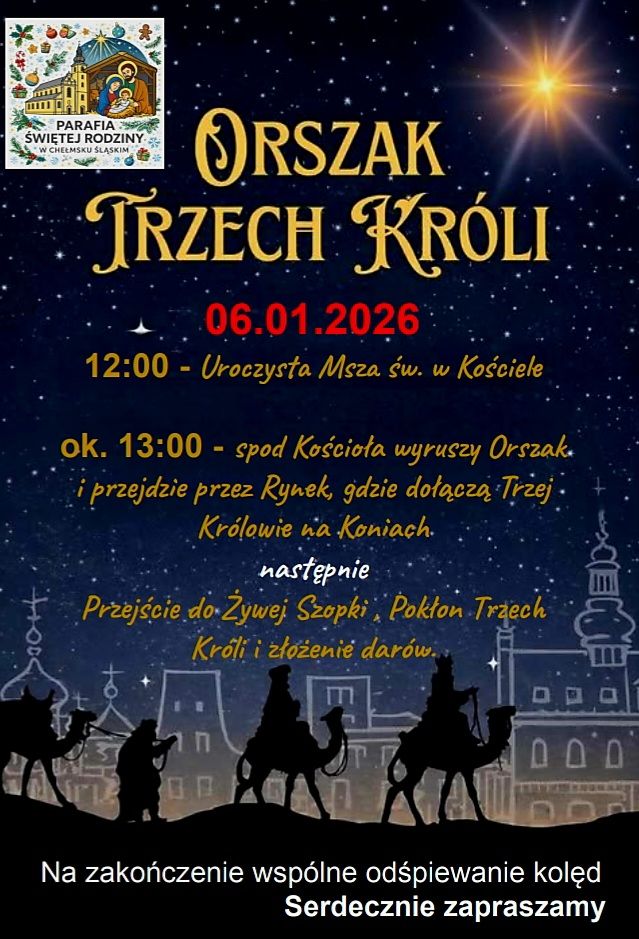 Parafia Świętej Rodziny w Chełmsku Śląskim zaprasza na Orszak Trzech Króli. Tegoroczne wydarzenie rozpocznie się o godz. 12:00 Mszą święta w Kościele.