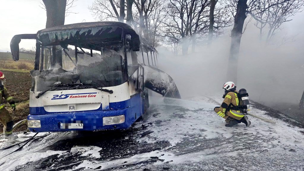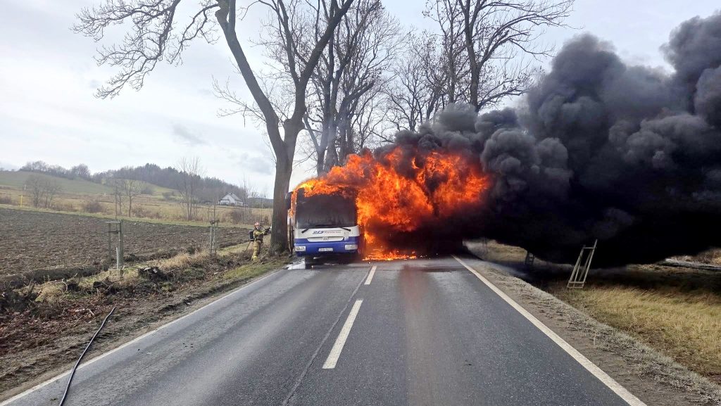 Na drodze Kamienna Góra – Ogorzelec, w okolicach Pisarzowic, doszło do pożaru autobusu . Służby prowadzą działania ratowniczo-gaśnicze