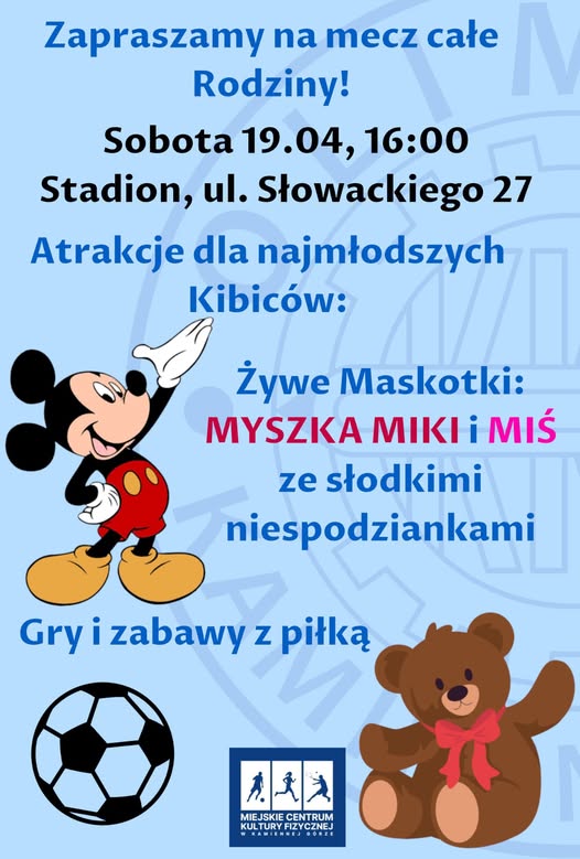Pod takim hasłem klub KKS Olimpia Kamienna Góra zaprasza całymi rodzinami na sobotni mecz, czekać na Was świetna zabawa – dla dzieci słodkie niespodzianki od naszych uroczych Miśków-maskotek, a w przerwie meczu gry i zabawy z piłką.