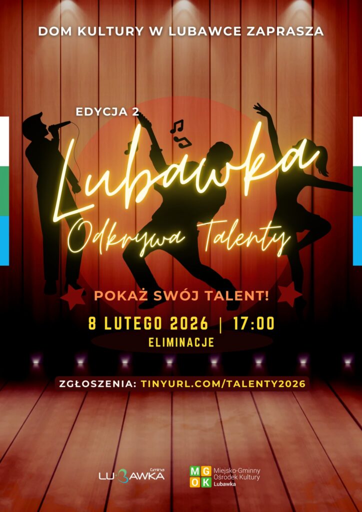 Już 8 lutego 2026 r. scena Domu Kultury w Lubawce znów wypełni się pasją, emocjami i odwagą! Szukamy osób z talentem muzycznym, tanecznym, wokalnym, aktorskim – i każdym innym, który zasługuje na światło reflektorów.