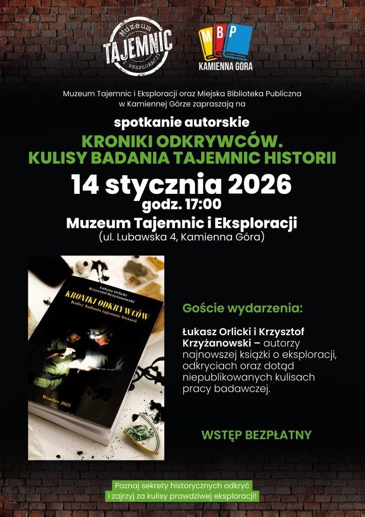 Muzeum Tajemnic i Eksploracji w Kamiennej Górze wraz z Miejską Biblioteką Publiczną zapraszają na spotkanie autorskie poświęcone książce „Kroniki odkrywców. Kulisy badania tajemnic historii”. Wydarzenie odbędzie się 14 stycznia 2026 r. o godz. 17:00 w siedzibie muzeum przy ul. Lubawskiej 4.