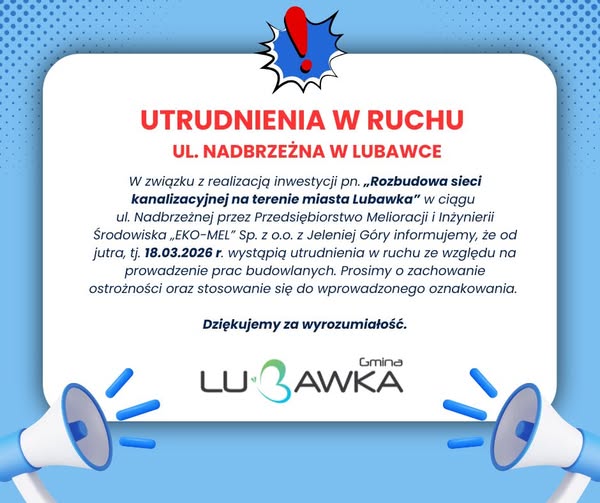 Od jutra (18 marca 2026 r.) kierowcy oraz piesi mogą napotkać utrudnienia na ul. Nadbrzeżnej w Lubawce.
