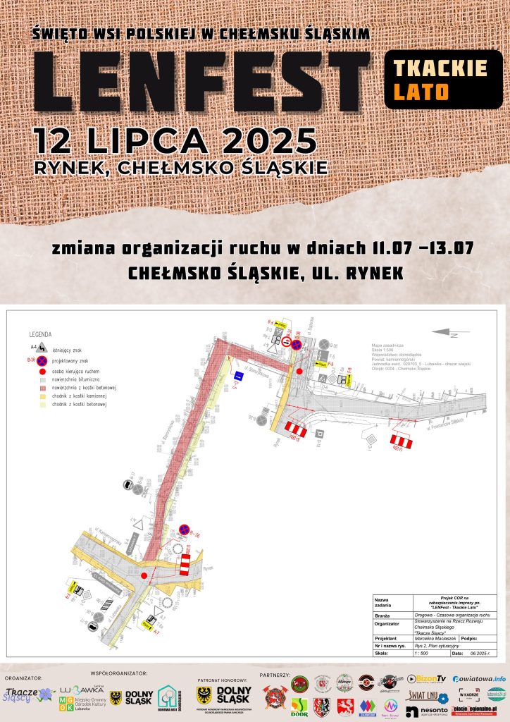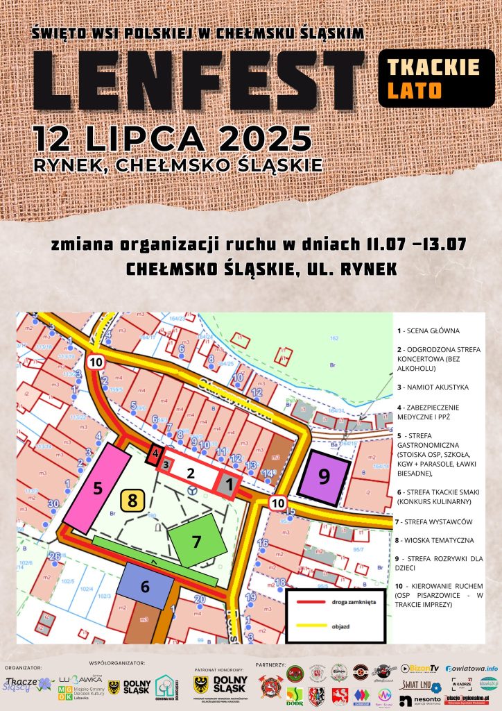 Szanowni Mieszkańcy i Goście, w związku z organizacją wydarzenia „LENFest – Tkackie Lato” informujemy o czasowym zamknięciu części dróg w centrum Chełmska Śląskiego.