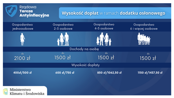 „Aby zrekompensować wzrost kosztów energii elektrycznej, cen gazu i żywności, w ramach Rządowej Tarczy Antyinflacyjnej, wprowadziliśmy dodatek osłonowy. Jest to realne wsparcie dla obywateli, na które przeznaczone zostaną ponad 4 mld zł” – podkreśliła szefowa resortu klimatu i środowiska Anna Moskwa. Minister zaznaczyła, że wsparciem objętych zostanie blisko 7 milionów gospodarstw domowych w Polsce, których przeciętne miesięczne dochody nie przekraczają 2100 zł w gospodarstwach jednoosobowych lub 1500 zł na osobę w gospodarstwach wieloosobowych.