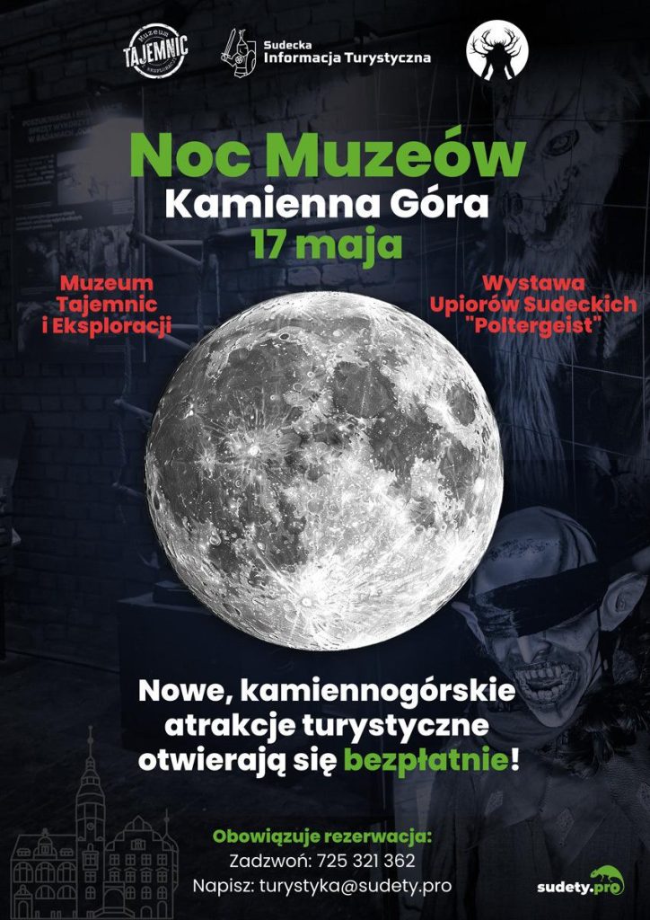Z 17 na 18 maja po raz pierwszy zapraszamy do udziału w Nocy Muzeów w dwóch nowych atrakcjach turystycznych Kamiennej Góry: Muzeum Tajemnic i Eksploracji oraz Wystawie Upiorów Sudeckich „Poltergeist”. Obie ekspozycje będą dostępne bezpłatnie dla wszystkich odwiedzających!